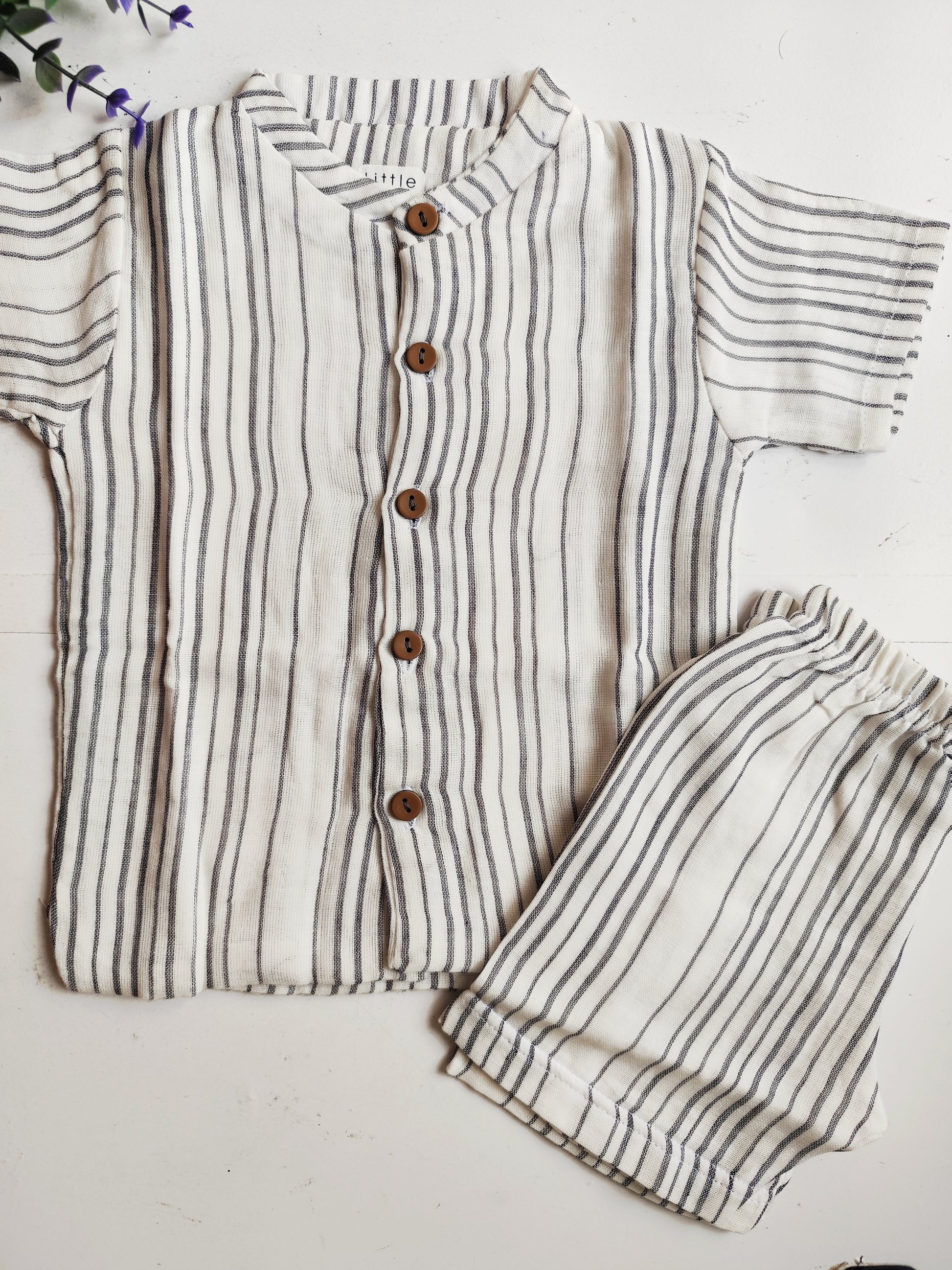 Add a touch of charm to your little one’s wardrobe with these stylish collared co-ord sets. Made from breathable muslin cotton, they feature a smart shirt-style top with wooden buttons and soft, elasticated shorts. Lightweight, gentle on skin, and perfect for both casual wear and special outings.