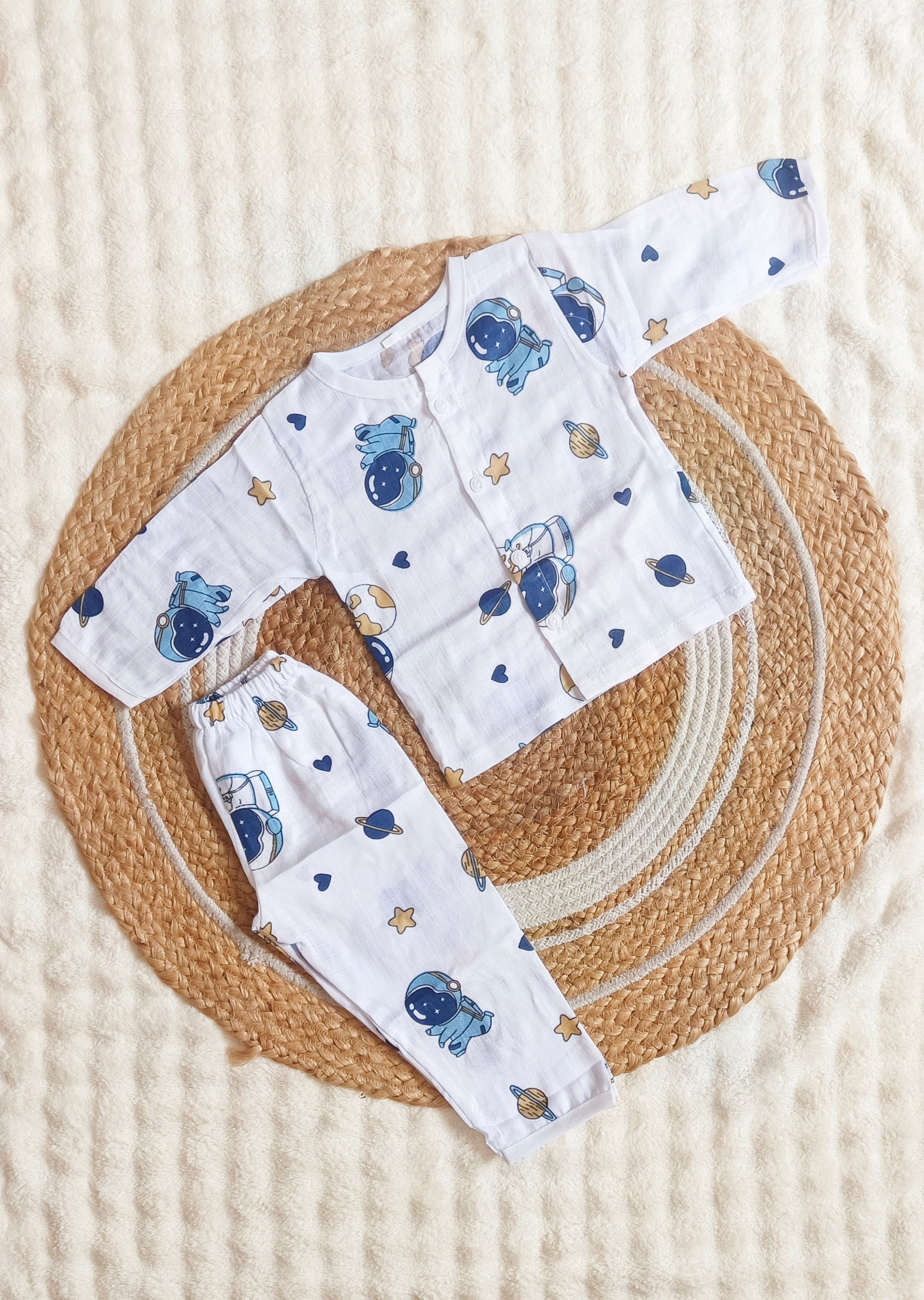 Keep your little one comfy and cosy all night with our soft muslin cotton night suits. Made from breathable, skin-friendly fabric, these sets are gentle on delicate skin and perfect for year-round wear. Each set features a front button-down top and matching elastic-waist pants for easy dressing and a snug fit. Adorned with adorable prints in vibrant colours, these night suits make bedtime fun while ensuring maximum comfort for your child.