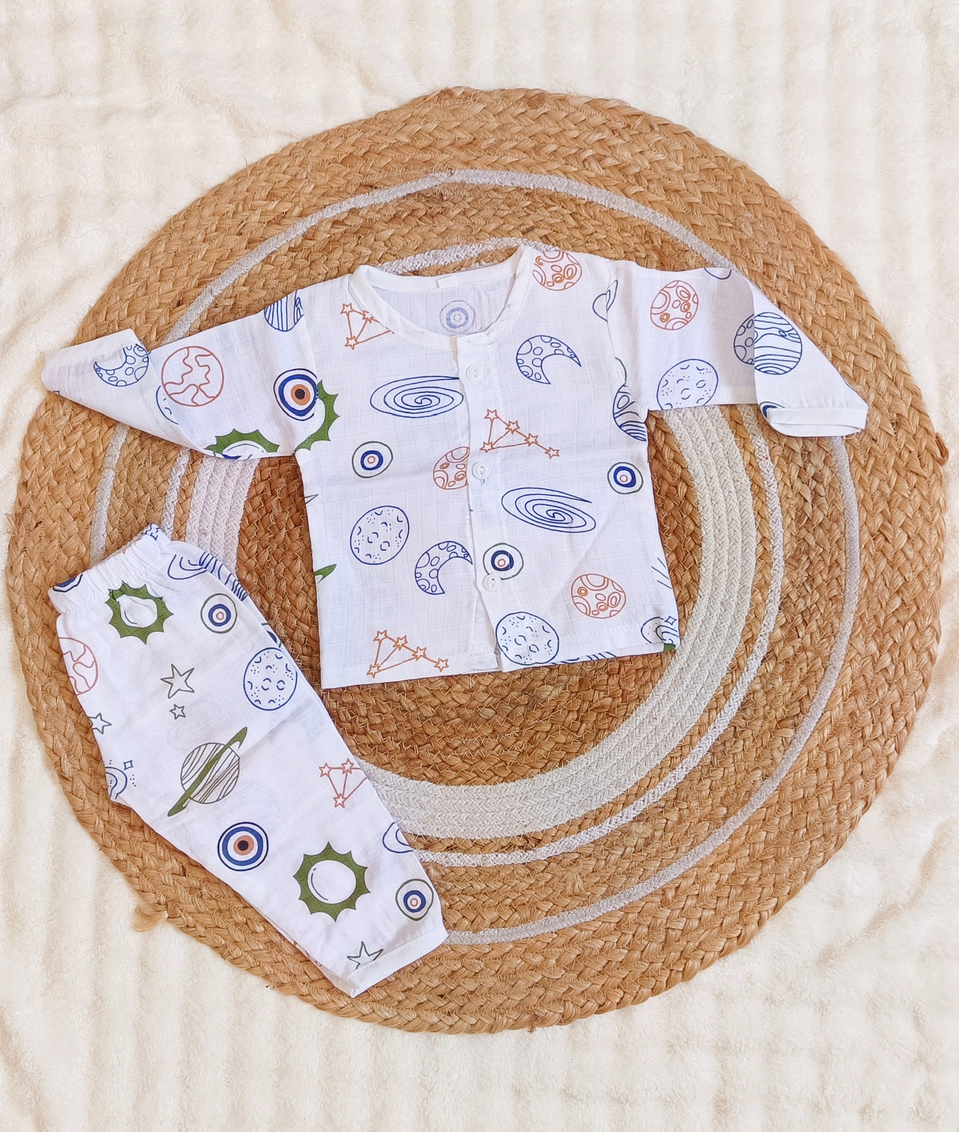 Keep your little one comfy and cosy all night with our soft muslin cotton night suits. Made from breathable, skin-friendly fabric, these sets are gentle on delicate skin and perfect for year-round wear. Each set features a front button-down top and matching elastic-waist pants for easy dressing and a snug fit. Adorned with adorable prints in vibrant colours, these night suits make bedtime fun while ensuring maximum comfort for your child. Ideal for everyday sleepwear or relaxed lounge time.